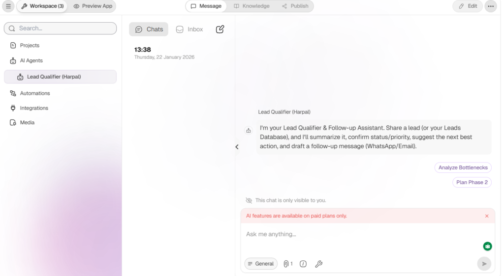 Pro Plan Required: AI Agents and AI Chat may show “AI features are available on paid plans only.” If you’re on Free, use the manual template method. If you upgrade, the agent can generate follow-ups and summaries instantly.