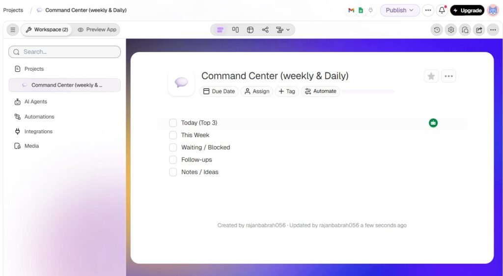 Once you do this, you can ask realistic questions like: “Which items are blocked and why?”, “What is overdue?”, “What should I do today for maximum impact?” The workspace becomes queryable.