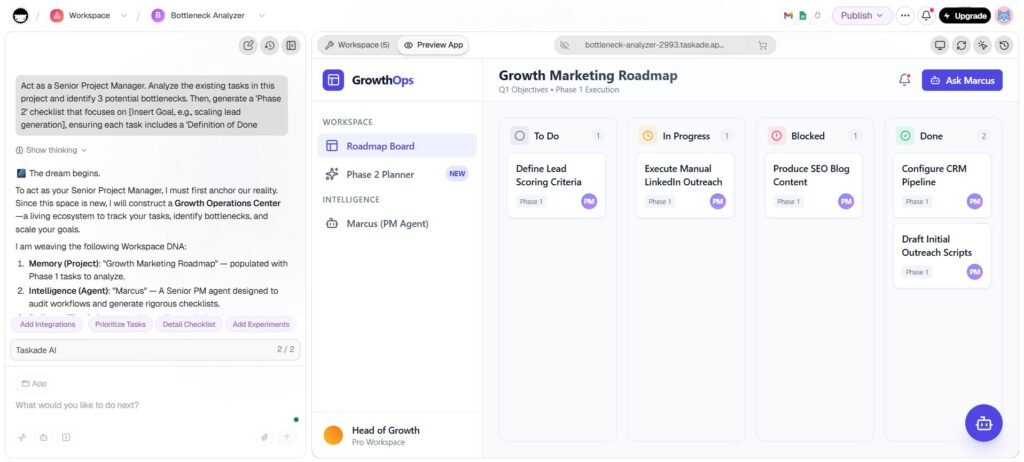Taskade’s multi-view approach is practical: list for execution, board for pipeline, calendar for scheduling, mind map for thinking. The mind map view becomes powerful when paired with AI expansion.