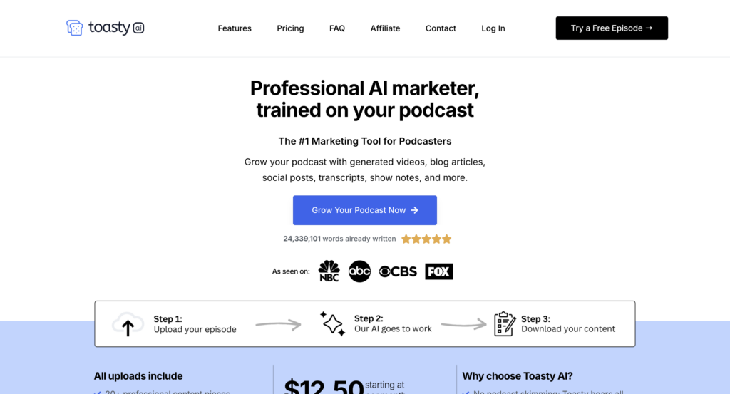 Toasty AI transforms podcast marketing by leveraging artificial intelligence to simplify and enhance essential tasks. Designed for both new and seasoned podcasters, it automates workflows like transcriptions, content creation, and social media management. By offering advanced tools, Toasty AI helps users save time and increase efficiency while focusing on delivering engaging episodes. Whether you’re starting your podcasting journey or scaling an established show, this platform caters to diverse needs with its flexible solutions.